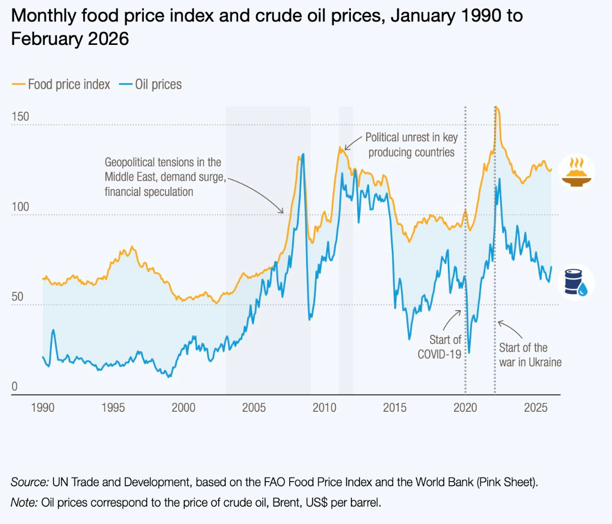 Fluctuations in food prices closely parallel those of oil prices, with agriculture heavily reliant on fossil fuels.